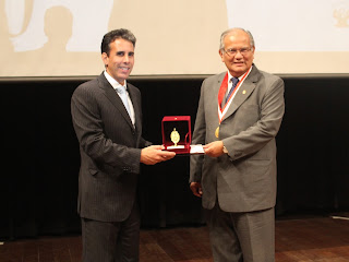 Rector (a.i.) UNI, Dr.Jorge Alva Hurtado, entrega distintivo de la Universidad al ministro de la Producción, Piero Ghezzi Solis. |