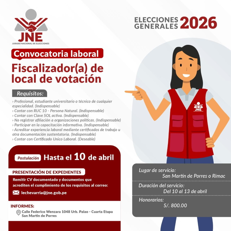JNE Elecciones Generales 2026: Convocatoria laboral de fiscalizadores de local de votación | Postulación hasta el 10 de Abril