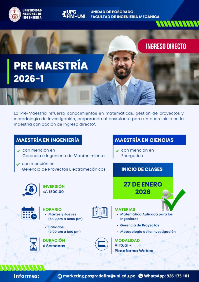 ![]() La Unidad de Posgrado FIM - UNI te invita a participar en la Pre Maestría 2026-1, diseñada para ingenieros y profesionales que buscan fortalecer sus conocimientos y acceder con mayor facilidad a nuestros programas de posgrado.