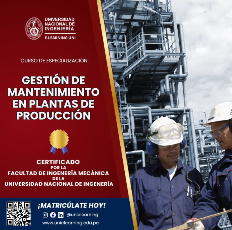 El Centro de Capacitaciones E- LEARNING UNI de la FIM de la UNI te invita a participar: CURSO DE CAPACITACIÓN: GESTIÓN DE MANTENIMIENTO EN PLANTAS DE PRODUCCIÓN | Fecha de Inicio 25 de Octubre