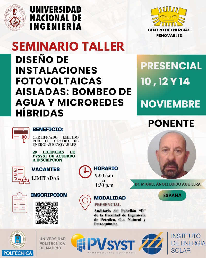 Centro de Energías Renovables-CER-UNI: SEMINARIO TALLER-DISEÑO DE INSTALACIONES FOTOVOLTAICAS AISLADAS: BOMBEO DE AGUA Y MICROREDES HÍBRIDAS”-PRESENCIAL | INICIO 10 DE NOVIEMBRE