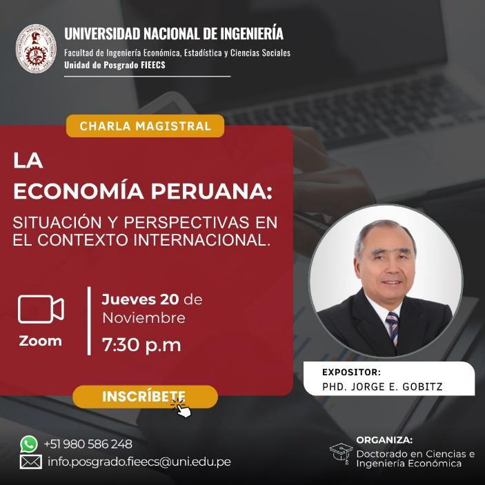 Unidad de Posgrado de la FIEECS invita a la Charla Magistral – La economía peruana: situación y perspectivas en el contexto internacional | Fecha 20 de Noviembre