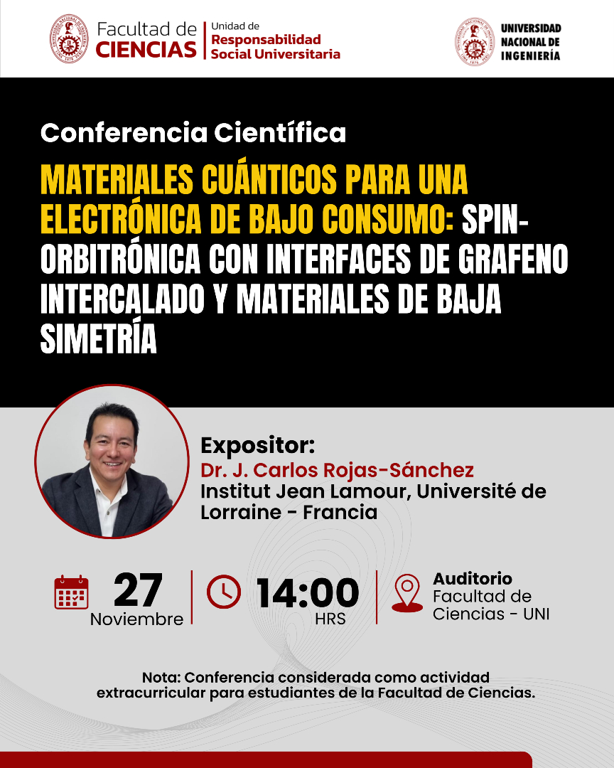 La Facultad de Ciencias invita a la comunidad universitaria y al público en general a participar del Jueves Científico: “Materiales cuánticos para una electrónica de bajo consumo: spin-orbitrónica con interfaces de grafeno intercalado y materiales de baja simetría”, que estará a cargo del Dr. J. Carlos Rojas-Sánchez, Institut Jean Lamour, Université de Lorraine UMR 7198 CNRS - Nancy, Francia. Fecha: 27 de noviembre Hora: 2:00 p.m. Lugar: Auditorio de la Facultad de Ciencias – UNI Transmisión en vivo: a través de nuestra página oficial de Facebook Nota: La conferencia será reconocida como actividad extracurricular para los estudiantes de la Facultad de Ciencias Sigue nuestras redes sociales para mantenerte informado sobre próximos eventos académicos: Facebook: URSU – Facultad de Ciencias UNI https://www.facebook.com/share/17BQ6XMaQz/?mibextid=wwXIfr Instagram: @ursufcuni https://www.instagram.com/ursufcuni?igsh=MTZxZmpyZzRmc2lu&utm_source=qr TikTok: @ursufcuni https://www.tiktok.com/@ursufcuni?_t=ZS-90YGqNNag3r&_r=1