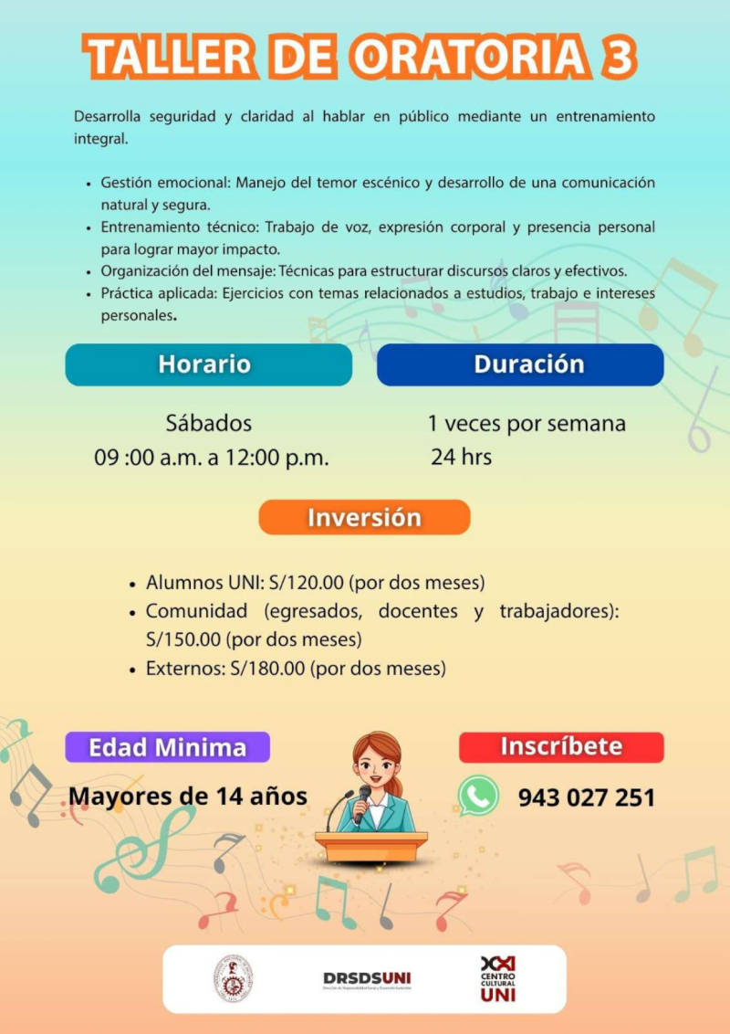 UNIDAD DE CENTRO CULTURAL: ¡Taller de Oratoria 3! ¡Aperturamos para los días Sábados! | Dirigido a la Comunidad UNI y al público en general