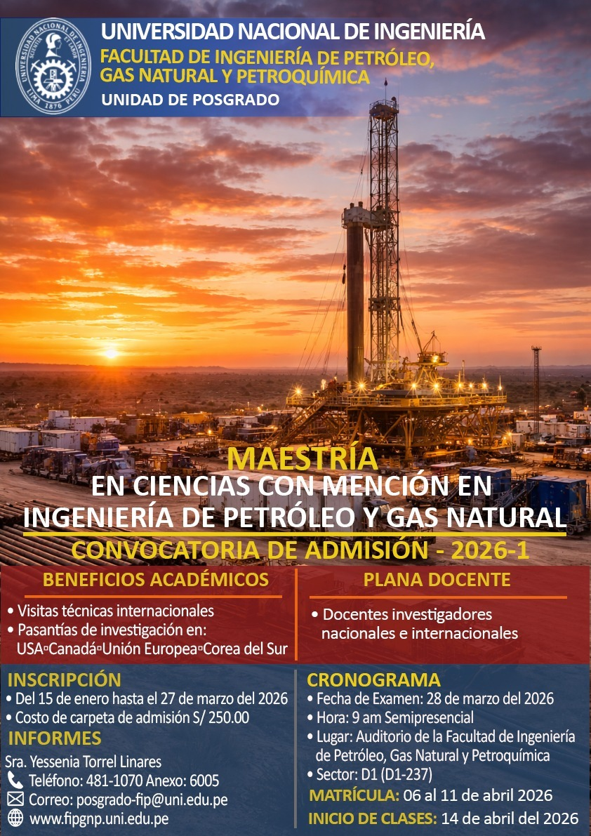 La Unidad de Posgrado de la FIPGNP se encuentra realizando una Convocatoria de Admisión 2026-1 Programa de Maestría en Ciencias con Mención en Ingeniería de Petróleo y Gas Natural | Inscripciones hasta el 27 de Marzo del 2026