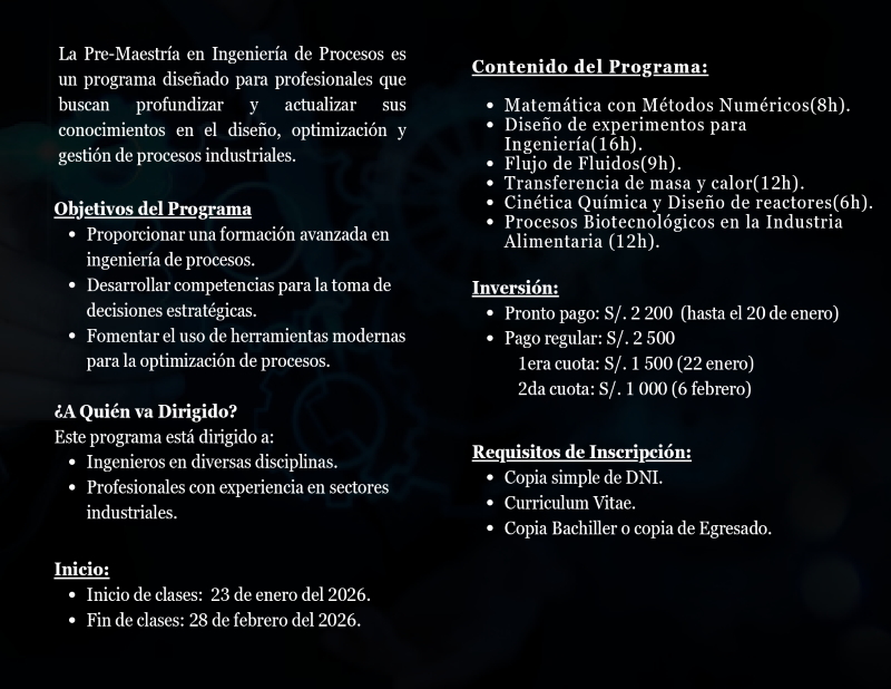 UNIDAD DE POSGRADO FIQT: PRE-MAESTRIA EN INGENIERÍA DE PROCESOS ADMISION 2026-1 | INICIO 23 DE ENERO DEL 2026