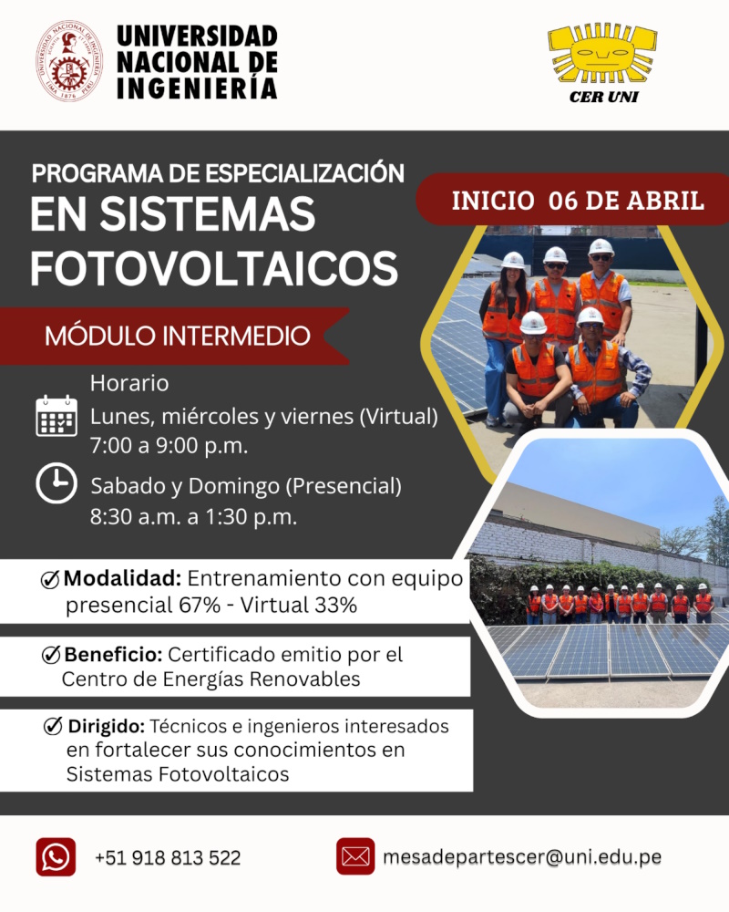 Centro de Energías Renovables-CER-UNI: PROGRAMA DE ESPECIALIZACIÓN DE SISTEMAS FOTOVOLTAICOS - MÓDULO INTERMEDIO | Inicio de clases: 06 de abril del 2026