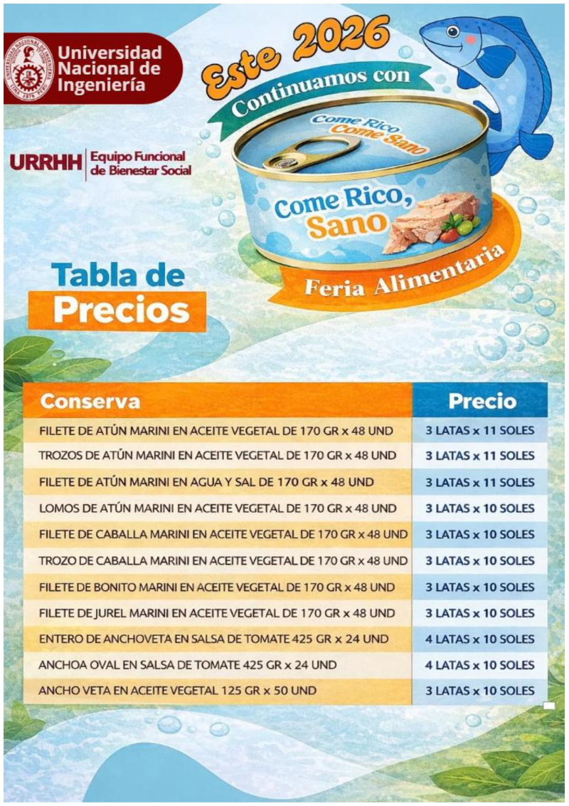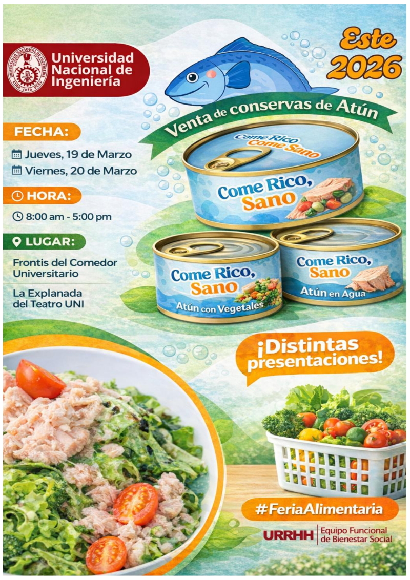 La Unidad de Recursos Humanos ha programado en el marco del plan de Bienestar Social 2026: la 5ta. Feria Alimenticia “COME RICO, COME SANO” | Fechas: 19 y 20 de Marzo