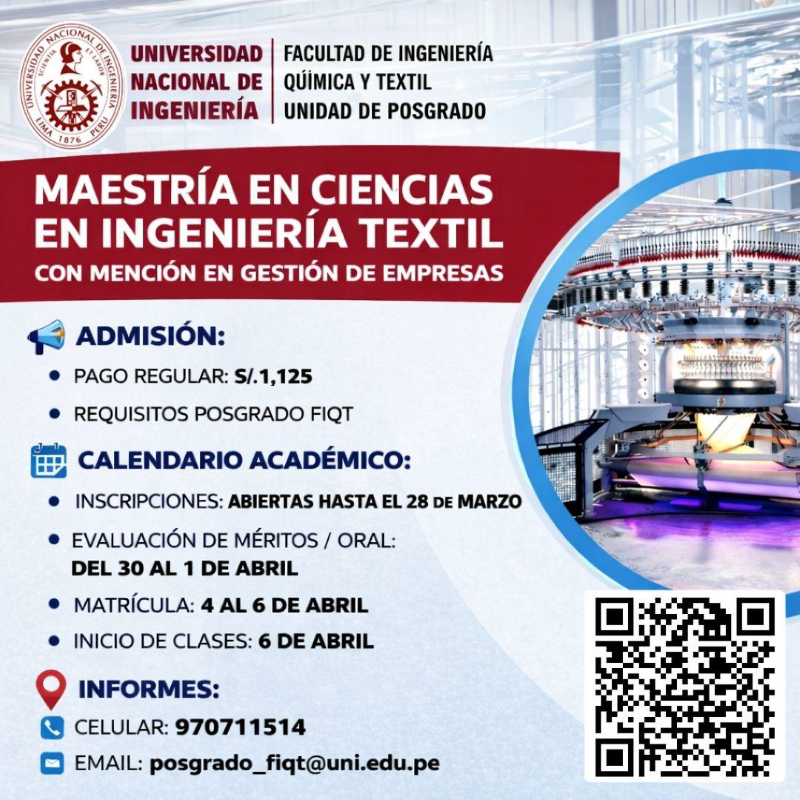 UNIDAD DE POSGRADO FIQT: MAESTRIA EN CIENCIAS EN INGENIERÍA TEXTIL CON MENCIÓN EN GESTIÓN DE EMPRESAS TEXTILES ADMISION 2026-1 | INSCRIPCIONES HASTA EL 28 DE MARZO
