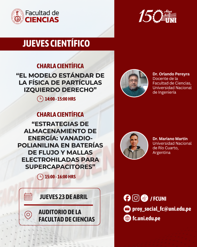 En el marco de los 150 años de aniversario de la Universidad Nacional de Ingeniería, la Facultad de Ciencias, a través de la Unidad de Responsabilidad Social Universitaria, le invita a participar en las siguientes charlas científicas: > “El Modelo Estándar de la Fı́sica de Partı́culas Izquierdo Derecho” a cargo del Dr. Orlando Pereyra > “Estrategias de almacenamiento de energía: Vanadio-Polianilina en baterías de flujo y mallas electrohiladas para supercapacitores” a cargo del Dr. Mariano Martín.