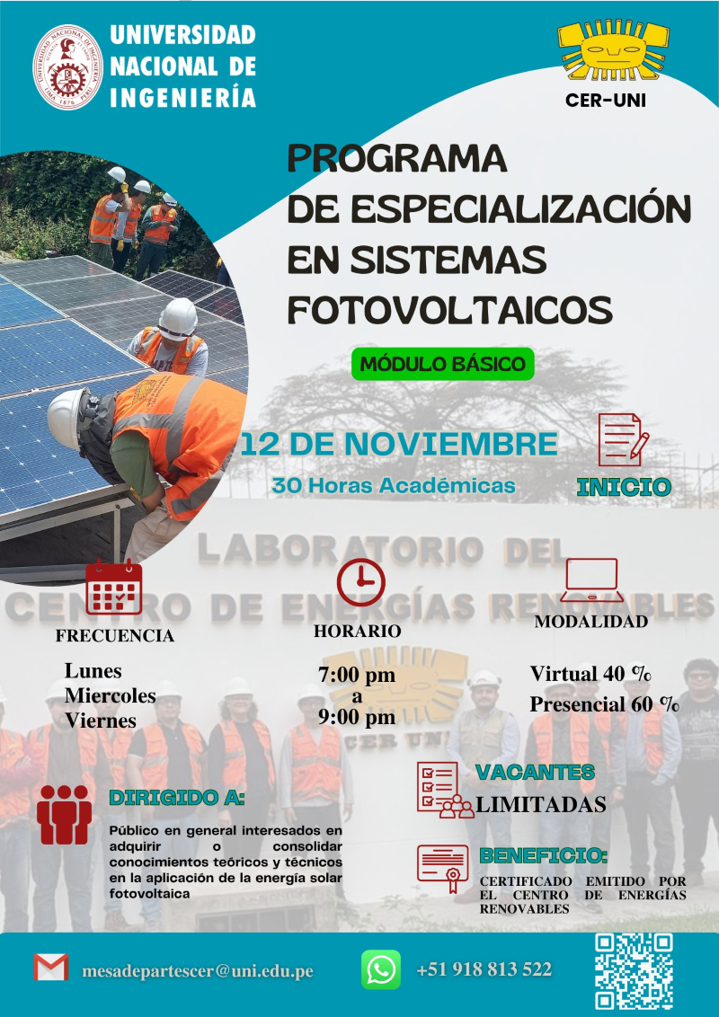 Centro de Energías Renovables-CER-UNI: PROGRAMA DE ESPECIALIZACIÓN DE SISTEMAS FOTOVOLTAICOS - MÓDULO BÁSICO | INICIO 12 DE NOVIEMBRE