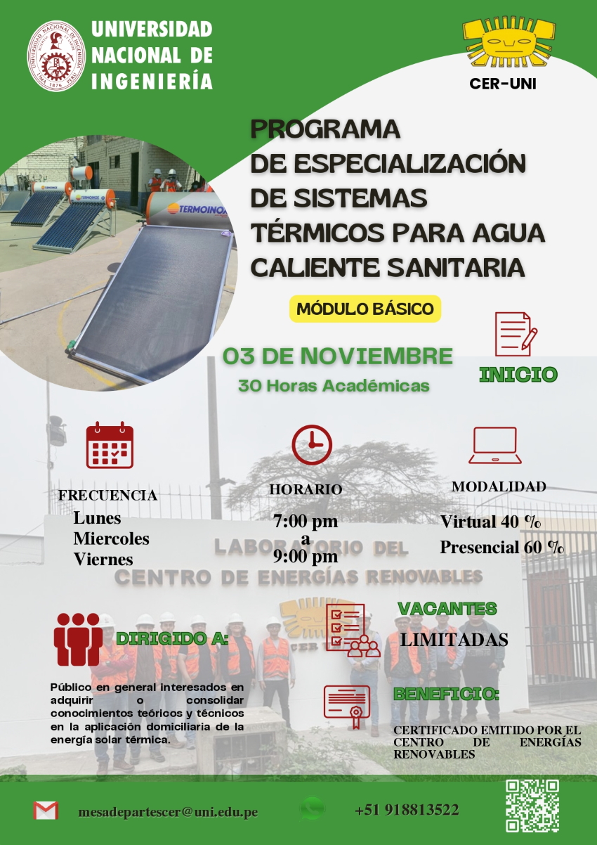 Centro de Energías Renovables-CER-UNI: PROGRAMA DE ESPECIALIZACIÓN EN SISTEMAS TÉRMICOS PARA AGUA CALIENTE SANITARIA-MODULO BÁSICO | Inicio 03 de Noviembre