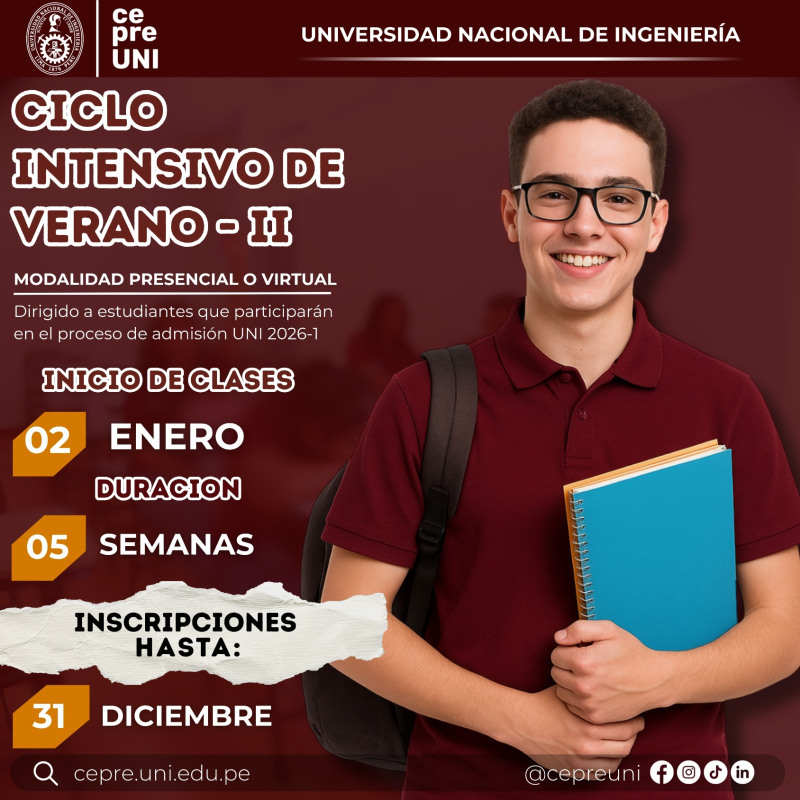 ¿Por qué estudiar con nosotros? Porque en CEPRE UNI te brindamos una preparación exigente, actualizada, con docentes especializados y enfocada en resultados reales. Miles de estudiantes alcanzan sus metas gracias a nuestra metodología académica. CICLO INTENSIVO II – 2026 El presente ciclo intensivo de verano se orienta a la preparación intensiva para el proceso de Admisión 2026-I de la UNI, sin embargo, la preparación que se imparte se adapta bien a los exámenes de admisión de las distintas universidades del Perú.
