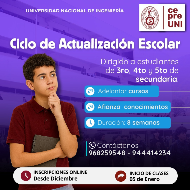 ¿Por qué estudiar con nosotros? Porque en CEPRE UNI te brindamos una preparación exigente, actualizada, con docentes especializados y enfocada en resultados reales. Miles de estudiantes alcanzan sus metas gracias a nuestra metodología académica. ACTUALIZACIÓN ESCOLAR 2026 Si quieres fortalecer tu base académica o prepararte para el siguiente nivel, este ciclo es para ti.