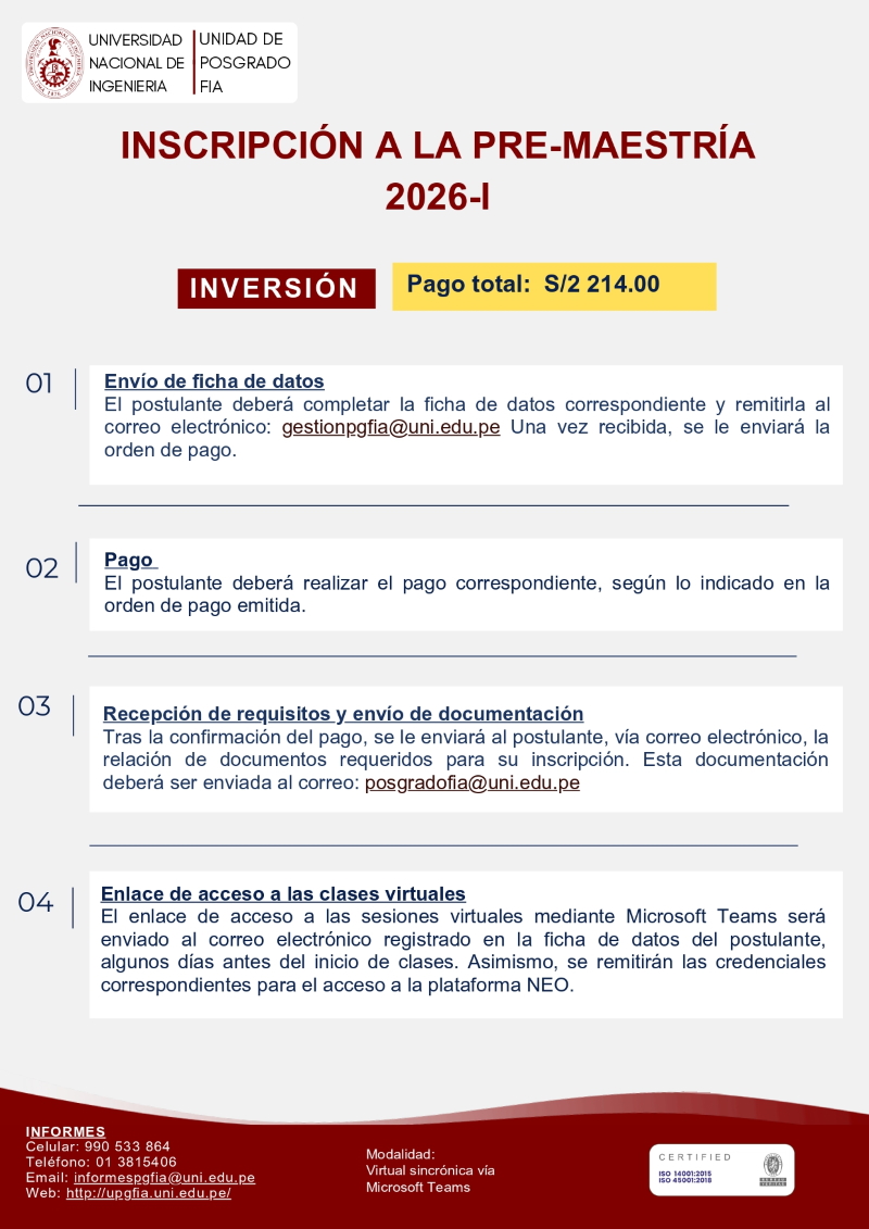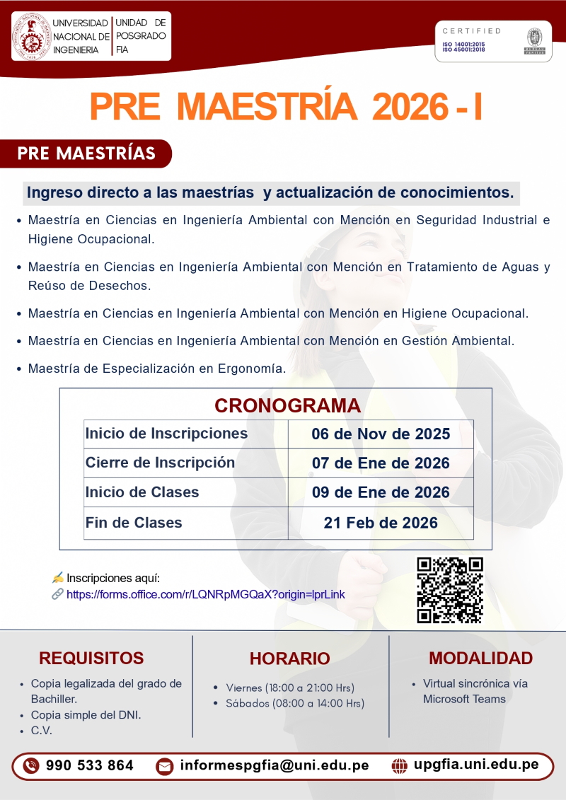 La Unidad de Posgrado de la FIM - UNI te invita a participar en la Pre Maestría 2026-1, diseñada para ingenieros y profesionales que buscan fortalecer sus conocimientos y acceder con mayor facilidad a nuestros programas de posgrado.