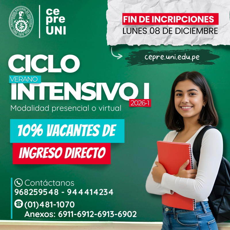 ¿Por qué estudiar con nosotros? Porque en CEPRE UNI te brindamos una preparación exigente, actualizada, con docentes especializados y enfocada en resultados reales. Miles de estudiantes alcanzan sus metas gracias a nuestra metodología académica. CICLO INTENSIVO I – 2026 El presente ciclo intensivo de verano se orienta a la preparación intensiva para el proceso de Admisión 2026-I de la UNI, sin embargo, la preparación que se imparte se adapta bien a los exámenes de admisión de las distintas universidades del Perú. Inscripciones hasta: 08 de diciembre