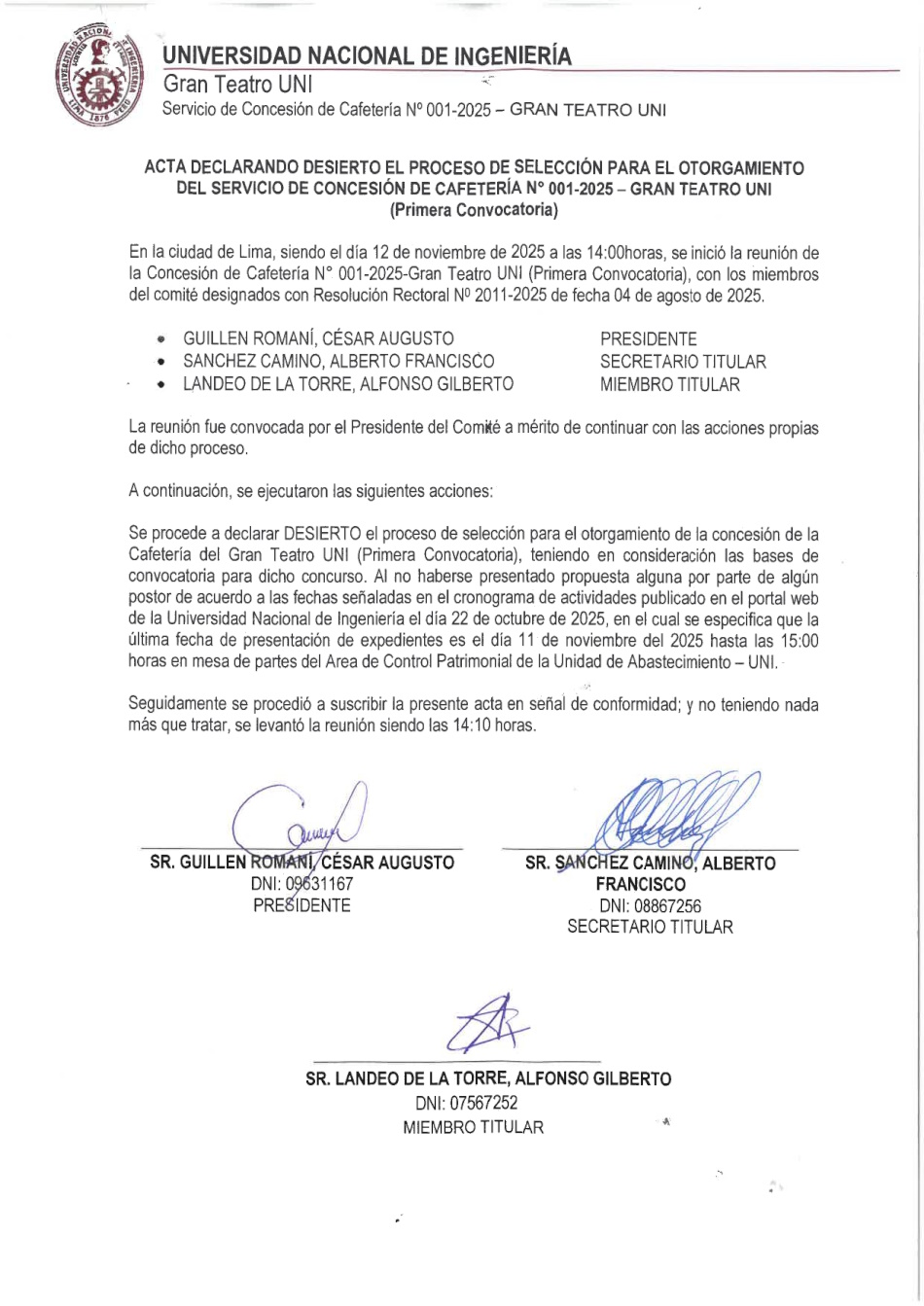 Lun Dic 1 ACTA DECLARANDO DESIERTO EL PROCESO PARA EL OTORGAMIENTO DE LA CONCESIÓN DEL SERVICIO DE CAFETERÍA N° 001-2025-GRAN TEATRO UNI - PRIMERA CONVOCATORÍA Published in Eventos Read 191 times Print Email Detalles: Fecha: 12 de Noviembre del 2025 Rate this item 1 2 3 4 5 (0 votes) Tweet