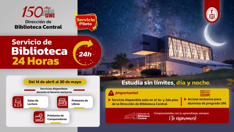 La Dirección de Biblioteca Central de la Universidad Nacional de Ingeniería (UNI) anunció la puesta en marcha de su nuevo Servicio Piloto de Biblioteca 24 Horas, una iniciativa orientada a fortalecer el acceso a recursos académicos y acompañar a los más de doce mil estudiantes durante todo su proceso de aprendizaje, incluso en horario nocturno.