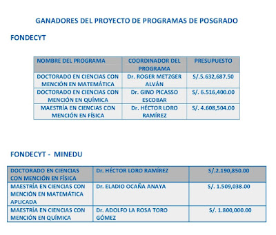 Durante la ceremonia se entregaron diplomas de reconocimiento a los docentes que obtuvieron fondos para los programas de doctorados y maestrías por el FONDECyT. Entre estos figuran el Doctorado en Ciencias con mención en Matemática por el Dr. Roger Metzger; y el Doctorado en Ciencias con mención en Química por el Dr. Gino Picasso Escobar. Asimismo, el Dr. Héctor Loro Ramírez fue reconocido por la Maestría en Ciencias con mención en Física.